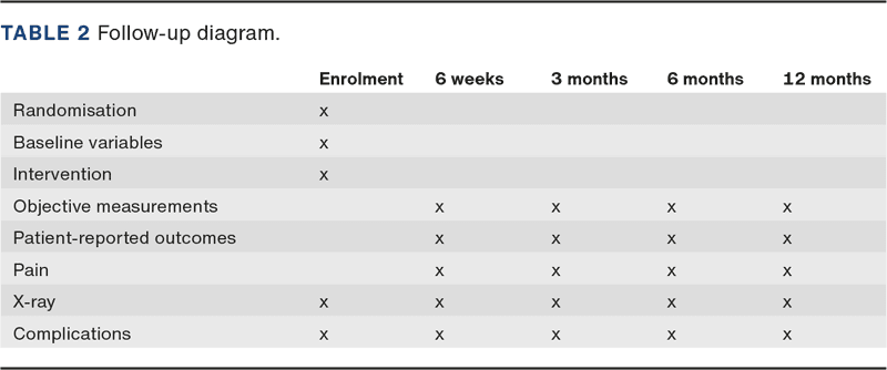 The SPIRIT diagram presents the follow-up schedule (Figure 1). The full overview of the follow-up is presented in Table 2.