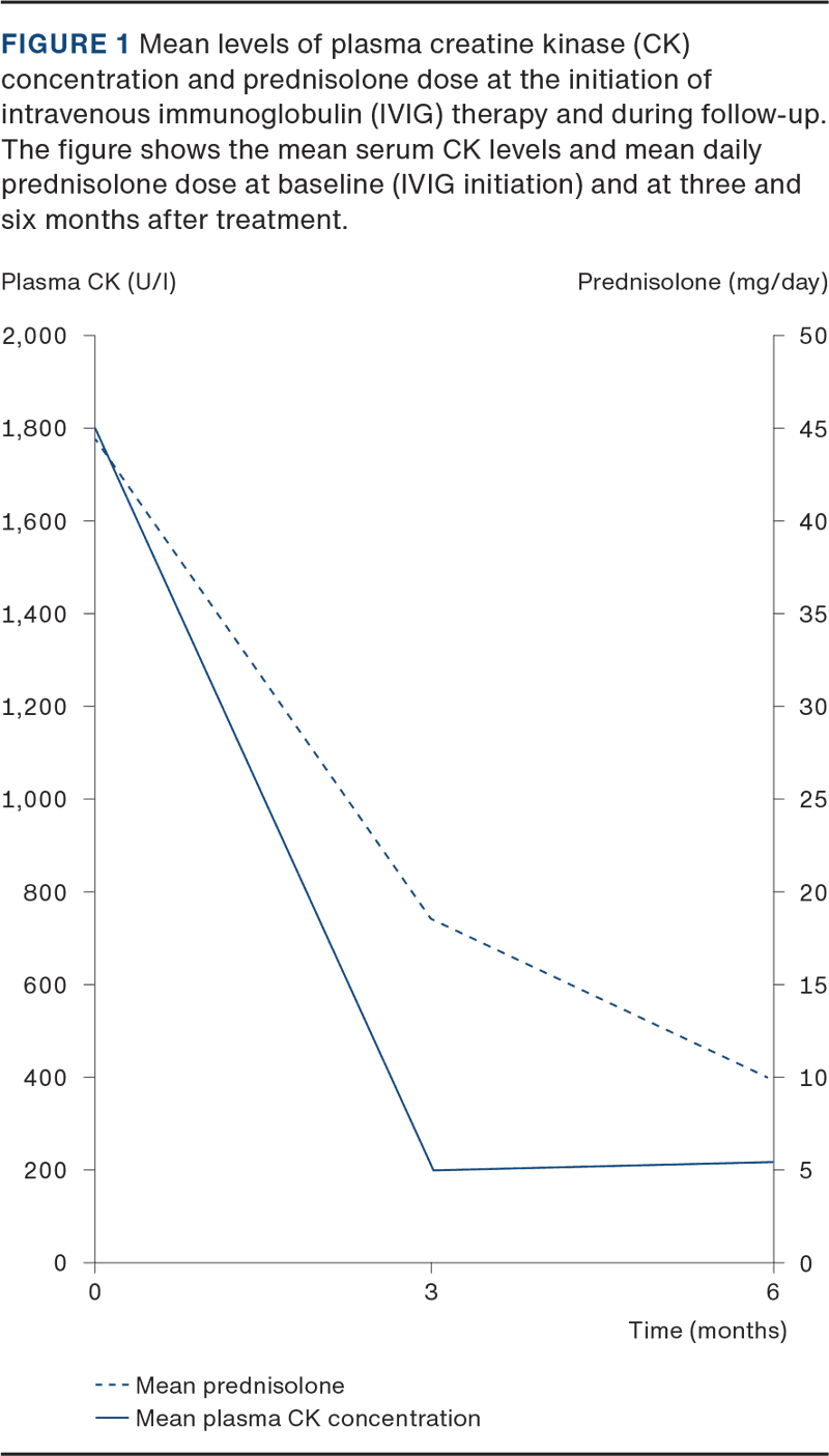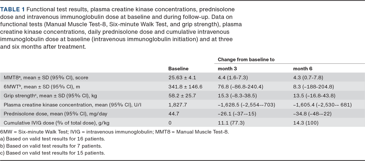 Outcomes were assessed at three and six months after IVIG initiation and included the following: I) changes in myositis-related symptoms, including dysphagia and cardiac involvement, II) performance on functional exercise tests, measured by the Manual Muscle Test-8, Six-minute Walk Test (6MWT), and grip strength, III) plasma creatine kinase (CK) concentrations and IV) prednisolone dosage.
