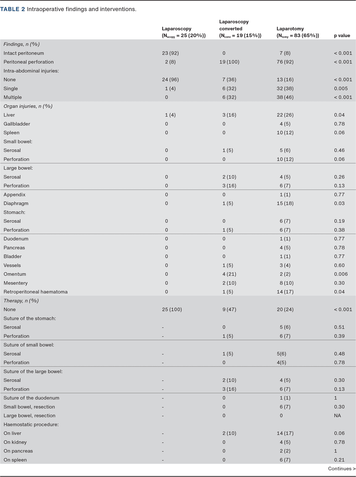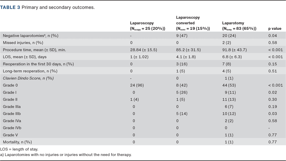 We separated the patients into three groups. Group one consisted of patients undergoing only laparoscopy (n = 25), group two included patients initially planned for laparoscopy but converted to laparotomy (n = 19), and group three comprised patients who had undergone direct laparotomy (n = 83). All conversions from laparoscopy to laparotomy were due to breach of the peritoneum. There was no statistical difference between groups regarding sex, age, CCI, type of admission, pulse and systolic blood pressure (Table 1). The laparotomy group had a significantly higher AIS and ISS than the other groups. Furthermore, extended focused assessment with sonography in trauma (E-FAST) was more often positive in the laparotomy group. There was one positive E-FAST in the laparoscopy group, which was due to pneumothorax and not an indication for abdominal injury. The CT more often showed positive findings, indicating intra-abdominal injuries in the laparotomy group. CT findings were the primary determinant for proceeding with laparotomy. The predominant indication for laparoscopy was the need for surgical evaluation due to the trauma mechanism and uncertainty regarding peritoneal penetration.