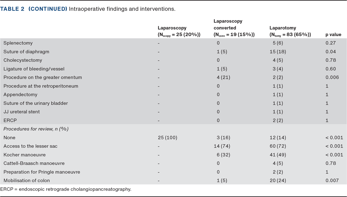 The most frequent surgical interventions were haemostatic procedures on the liver (16%) and suture of the diaphragm (16%). The most frequently performed procedures to review the abdomen were obtaining access to the lesser sac (omental bursa) (73%) and the Kocher manoeuvre (46%). Fifteen laparotomies (15%) involved no further procedures to examine the abdominal cavity. Non-expanding retroperitoneal haematoma (8%) and non-bleeding liver lesions (6%) were the most common intraoperative findings, for which no further therapy was needed.