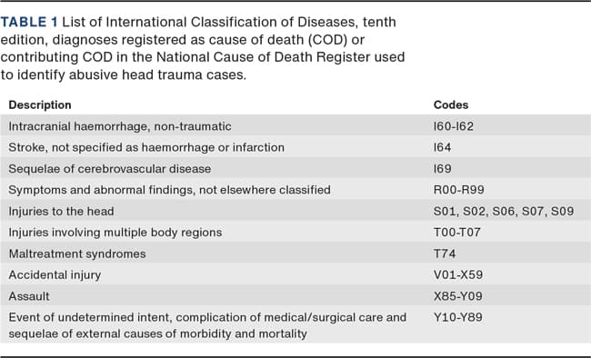 We identified AHT cases based on the conclusion of the autopsy of inflicted head trauma. We excluded cases if the report raised suspicion of inflicted head trauma but was inconclusive. Using the personal identification number that is given to all persons born or living in Denmark, we linked cases to the CODR.
