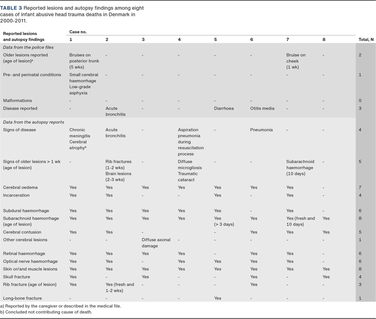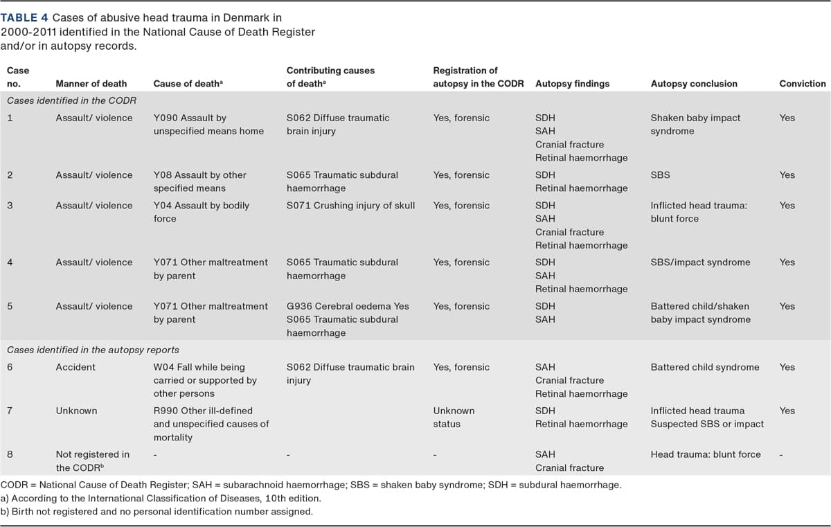 METHODS: This was a nationwide retrospective study. We identified AHT cases in the National Cause of Death Register (CODR) and in forensic archives and compared data from the two sources. Moreover, we collected data on medical history, witness statements and conviction reports from police files and the Director of Public Prosecutions.