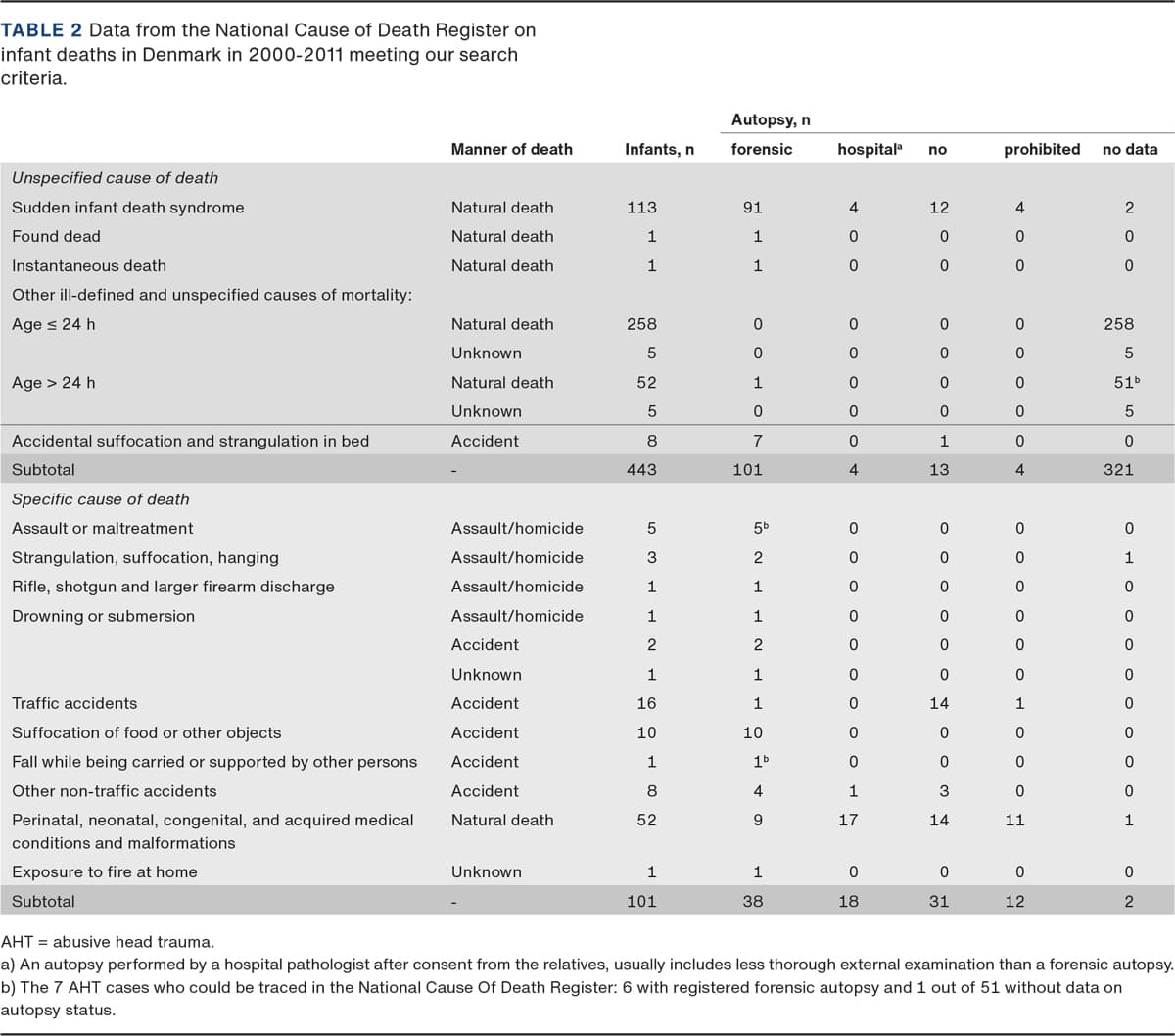 Our results revealed an unexpectedly high number of infants with unexplained or unspecific COD. We assessed all autopsies that concluded head trauma as the COD; thus, we do not expect more AHT cases among the infants who have been autopsied. However, forensic autopsy is warranted for all unexplained infant deaths to avoid missing any AHT cases.