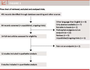 The search yielded 14 studies of IN fentanyl in the ED and prehospital setting, and one ongoing trial. Twelve studies met the inclusion criteria and were included in the final analysis (Figure 1). The included studies did not present a sufficiently homogenous group of trials to perform a meta-analysis. Consequently, only a qualitative analysis was conducted.