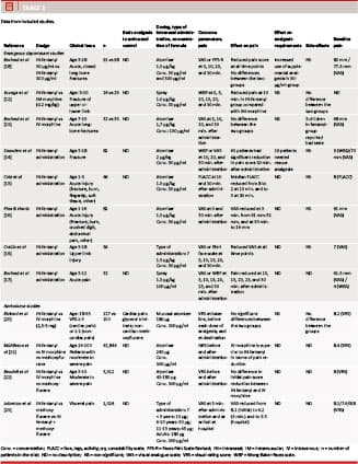 As illustrated in Table 1, we divided the included studies into two groups: ED studies and Ambulance studies. ED studies were defined as studies investigating the use of IN fentanyl in patients not yet examined by a doctor.