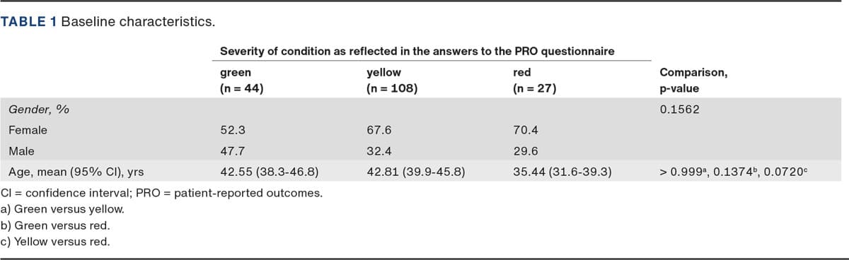 RESULTS. We found a significant difference between the triage of the neurologist and that of the PRO algorithm. The neurologist and PRO algorithm agreed regarding triage colour in 48.6% (37.4-59.9%) of the questionnaires (p < 0.0001). The neurologist and the PRO algorithm identified the same triage colour in 64.3% (38.8-83.7%) of the green baseline questionnaires (p < 0.0001), 46.7% (32.9-60.9%) of the yellow baseline questionnaires (p < 0.0001) and 38.5% (17.7-64.5%) of the red baseline questionnaires (p = 0.0016).
