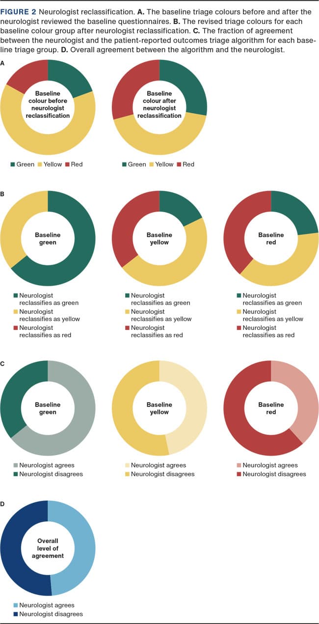 METHODS. A neurologist reviewed the answers to the PRO questionnaires, and, based on the severity of the answers, the neurologist assessed whether or not the patients should be reclassified into another triage colour group.