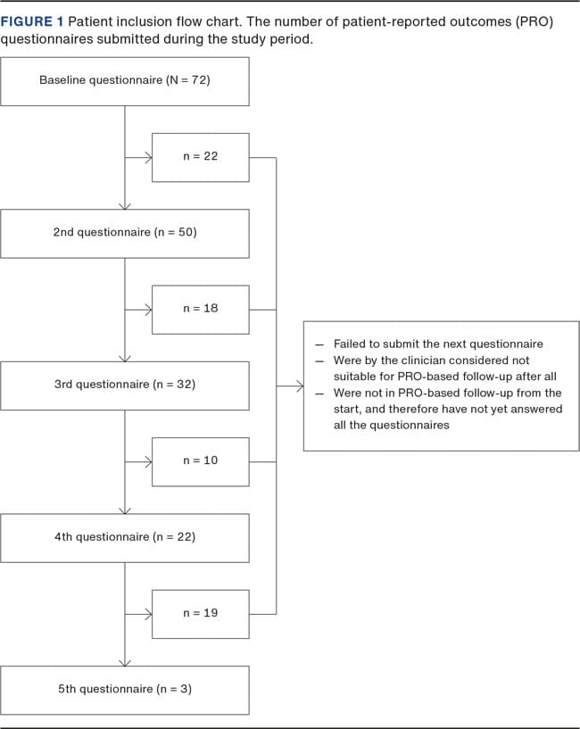 All patients were evaluated individually regarding eligibility by a specialised nurse or physician before inclusion in PRO-based follow up. Patients were excluded if unable to understand written Danish or to use a computer/tablet.