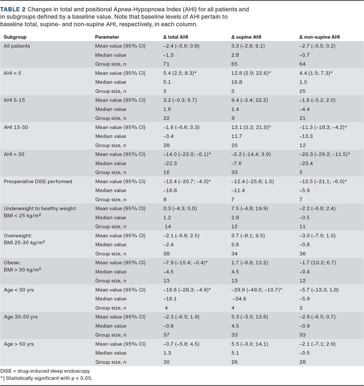 Changes in AHI values are presented in Table 2. A statistically significant improvement in total AHI was observed in patients with a baseline > 30, and for non-supine AHI with a baseline > 15. In contrast, a significant worsening of AHI in any position was observed in patients with no baseline OSA, i.e AHI < 5, and in supine AHI if the baseline was 15-30.