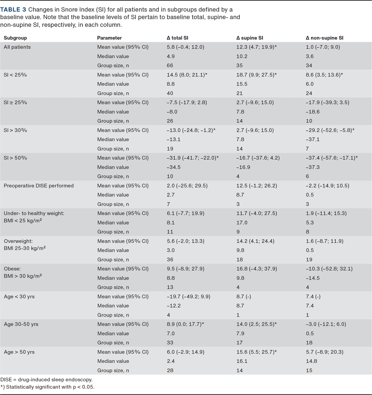 In general, we found that symptoms improved after surgery, but improvements in AHI and SI were observed only in patients with a baseline total AHI > 30, a non-supine AHI > 15 and a total or non-supine SI > 30%. Patient evaluations are naturally susceptible to the placebo effect, and thus there are limits on any conclusion drawn from a case series without a control group. Other mechanisms may, however, be in play; as previously demonstrated, subjective tiredness does not necessarily correlate with AHI [6]. Moreover, in our opinion, assessment of sleep disordered breathing needs to be more nuanced than what can be evaluated by CRM. We consider subjective symptom relief a primary endpoint in sleep surgery. The drop in ESS was statistically significant but hardly relevant, considering a minimal clinically important difference of 2 [7]. The insignificant change in the scored impact of snoring on quality of life seems contrary to the reported subjective improvement in snoring; however, the discrepancy might be due to patients not experiencing their own snoring firsthand, which makes scoring ambiguous and difficult.