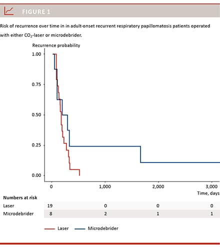 No significant correlations were observed regarding age or gender distribution. Figure 1 shows the correlation between time to recurrence and surgical method (laser or microdebrider). No difference was noted between the two methods.