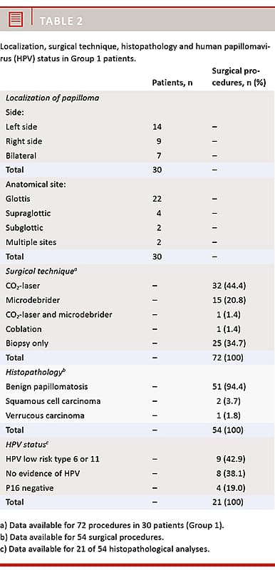 papilloma, light koilocytotic atypia, squamous cell papilloma, invert papilloma, papillomatosis and polyps, HPV type 6, HPV type 11, HPV. Searches were combined with localization to the larynx. Medical records were reviewed to extract clinical data, including age, gender, age of disease onset, date of first surgery, total number of surgeries and last date of follow-up. For patients diagnosed before 2004, onset of disease was defined as the first date a histopathologic analysis was performed since the real date of diagnosis was not available.