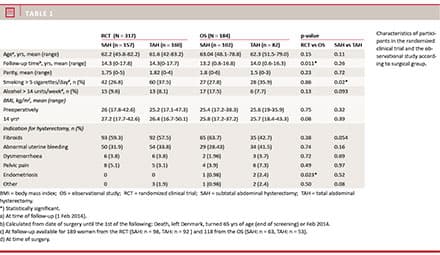 The participants in the RCT and the OS did not differ with regard to baseline characteristics (Table 1) except for mean follow-up time, which was longer for the RCT; however, the difference is not clinically relevant. More women in the TAH group than in the SAH group were smokers at the time of surgery. No other significant differences were found with regard to participant characteristics. The results from the RCT and the OS were comparable; these separate results are shown in the tables. In the text below, we present the results based on pooled data from the RCT and the OS.