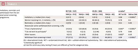Table 2 summarises invitations to screening as well as active withdrawals from screening. We found no difference between surgical groups in the number of