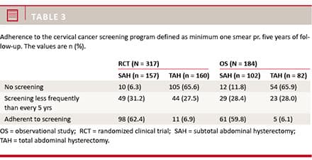 Methods: Data regarding adherence to screening and pathology results from the national Danish registry (Patobank) were obtained on women from a randomised clinical trial and an observational study of subtotal versus total abdominal hysterectomy from the time of surgery until 2014.