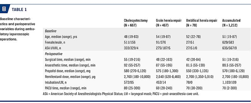Patients underwent the three following surgical procedures: laparoscopic cholecystectomy and laparoscopic inguinal and umbilical hernia repair. From 1 June 2013 to 31 March 2015, patients were included in this uncontrolled prospective study. The STROBE guidelines for reporting observational studies were followed. Consecutive patients of American Society of Anesthesiologists Physical Status (ASA) I-II were included. Prior to study start, it was decided that ASA III patients would be evaluated individually before ambulatory surgery. Patients with obstructive sleep apnoea, known difficult airways, a BMI > 40 kg/m2, preoperatively stated social/logistic reasons and patients with previous drainage of the gallbladder and major upper abdominal surgery were excluded from ambulatory operation.