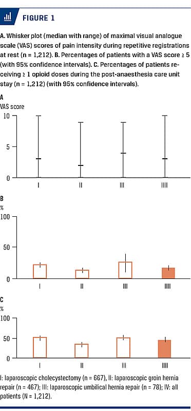 This prospective study using a multimodal analgesic regimen showed that pain was very rarely the limiting factor for not being discharged after ambulatory laparoscopic surgery. Out of the 1,212 patients, only 14 patients (1%) were admitted due to post-operative pain and 50% of all patents were discharged within 70 minutes. Opioid use and pain scores between laparoscopic cholecystectomy, inguinal, or umbilical hernia repair did not differ significantly. The level of the VAS pain scores in the first post-opeative hours in the PACU were comparable with results reported from other studies [1]. The surprisingly low number of admittances due to pain may be attributed to the use of a multimodal analgetic regimen including preoperative dexamethason, which is in line with reports from earlier studies [9].
