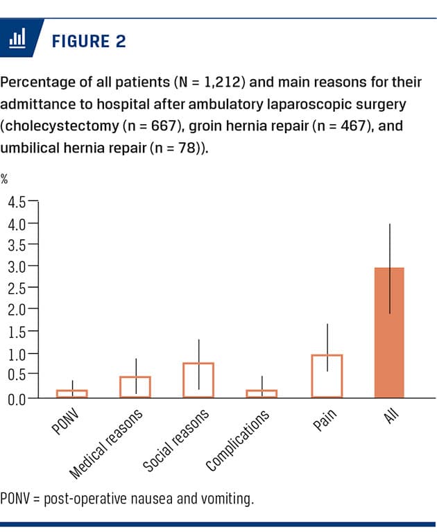 In 1,212 patients undergoing ambulatory laparoscopic surgery with a routine pneumoperitoneum of 12 mmHg and a multimodal analgesic regimen, only 1% were admitted overnight due to pain.