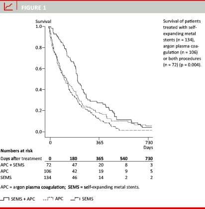Regarding survival, SEMS or APC are equivalent treatment modalities. Temporary addition of palliative chemotherapy or chemoradiation increases survival.