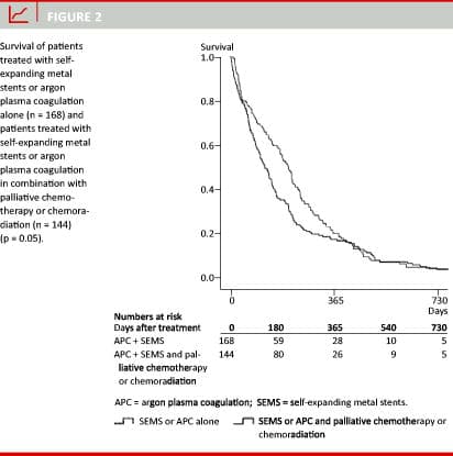 Results: A total of 707 procedures (246 SEMS procedures and 461 ablations) were performed. No patients died in relation to the procedures. Minor bleeding during APC was seen in 20 patients. Early complications to SEMS were migration and misplacement. A single perforation with the guide-wire was seen. Late complications were tumour overgrowth and food impaction. A single treatment with SEMS or APC was performed in 115 (37%) and 49(16%) patients, respectively. SEMS replacement was necessary in 17 (5%) patients. Repeated APC treatments were necessary in 57 (18%) patients. The median time of survival in patients treated with SEMS, APC or both procedures was 134 days, 114 days and 215 days (p = 0.004), respectively. The survival in patients palliated with SEMS and/or APC alone was significantly lower compared to those who were palliated with SEMS and/or APC in combination with chemoradiotherapy. The median time of survival was 120 days in SEMS and 203 days in APC patients (p = 0.05).