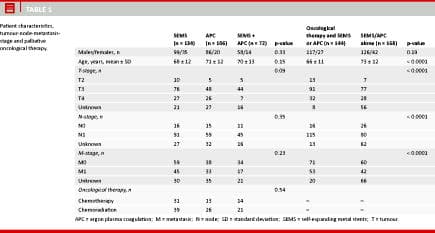 Figure 1 shows the survival of patients treated with SEMS alone, APC alone or both procedures. At the censoring date, all patients were dead. The median time of survival was 134 days (confidence interval (CI): 95-173 days) for SEMS, 114 days (69-159 days) for APC and 215 days (183-247days) (p = 0.004) for both procedures. No significant differences in age, sex, TNM-stage, use of palliative chemotherapy or chemoradiation were seen between the groups (Table 1).