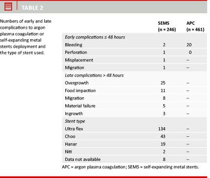 The complications to APC or stent deployment are shown in Table 2. In the majority of the patients, the procedures were uneventful and well tolerated. No patients died in relation to the procedures.