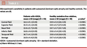 The present study is part of a cross-sectional study of ADOA that aims to characterise retinal anatomy and visual fields in a homogenous group of patients with c.2826_2836delinsGGATGCTCCA mutation in OPA1 [6]. The purpose of the present report is to describe microperimetric light sensitivity and fixation patterns in c.2826_2836delinsGGATGCTCCA ADOA and a control group of mutation-free relatives.