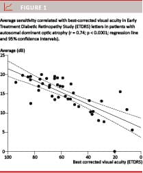 In ADOA, average sensitivity increased with increasing GC-IPL thickness (r = 0.38, p = 0.012). There was no relationship between average sensitivity and the average RNFL thickness (r = 0.29, p = 0.06).