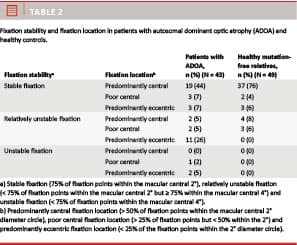 Stable fixation was found in 58% (25/43) of ADOA patients and 86% (42/49) of controls, relatively unstable fixation in 35% (15/43) of ADOA patients and 14% (7/49) of controls, whereas unstable fixation was found only in ADOA, where the prevalence was 7% (3/43) (Figure 2).