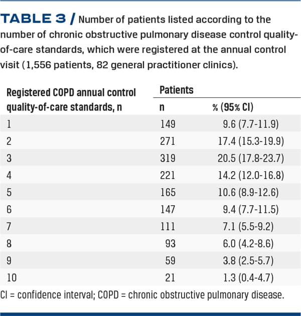 In more than 50% of the patient journals, no more than three of the ten quality-of-care standards were registered at the annual COPD-control visit. These were: number of exacerbations during the past year, smoking status and vaccination against influenza. The remaining seven quality-of-care standards were recorded only between 12% (95% CI: 8.9-17.1%) and 43% (95% CI: 38.0-47.4%) with the measurement of peripheral oxygen saturation by pulse oximetry as the lowest. Only 1.3% (95% CI: 0.4-4.7%) of the 1,556 patients had all ten standards of care documented in their electronic record form. Only 28% (95% CI: 23.1-33.0%) of the patients had six or more quality-of-care standards registered, whereas 10% had just one quality-of-care standard registered. The mean number of registered quality-of-care standards was four.