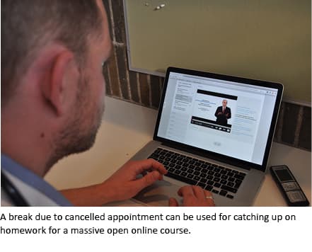 This study shows that a large number of freely available MOOCs are relevant for physicians and that they have a reasonable workload. With MOOCs, course participation is no longer limited by time of day or geographic location. For example, a 20-minute window of time freed up by a cancelled appointment may be sufficient to watch a lecture or follow up on homework.