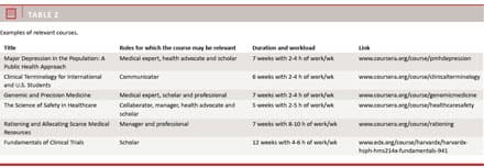 In total, 165 courses were found relevant or possibly relevant to one or more of the seven roles. Of these, 100 (39%) were rated as being relevant or possibly relevant for more than one role: 82 (50%) covered two roles, 15 (9%) covered three roles, and three (2%) covered four roles. For each of the seven roles, at least one course was relevant or possibly relevant. Two roles had a markedly higher number of relevant or possibly relevant courses – medical expert (57 courses) and scholar (75 courses) – compared with the other roles (Figure 1). All relevant and possibly relevant courses are summarised in Additional file 1. Examples are listed in Table 2.