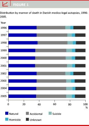 This retrospective study was carried out by searching the computerized archives of the three Danish departments of forensic medicine. The study period chosen was 1 January 1996 to 31 December 2005, a total of ten years. The following data were registered for each year: the number of medico-legal autopsies, age, sex and manner of death (natural death, accidental death, suicide, homicide or unknown).