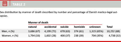 In a Norwegian study, the corresponding figures were approximately 66% and 58%, respectively [10]. In Sweden, the overall medico-legal autopsy frequency in unnatural deaths (suicide, homicide and accidental deaths) is 68% [11]. The Finish frequencies reach 99.5% in suicides and 87.2% in accidental deaths [3]. These divergent autopsy frequencies can be ascribed both to differences in legislation and in request behaviour among the police, and they may also be ascribed to differences in the assessment of the importance of performing an autopsy as well as to economic priorities [1-6, 12].