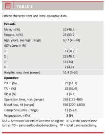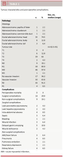Results: A total of 44 patients (93.7%) had ductal adenocarcinomas. In all, 39 patients (83%) had T3 tumours, and 38 patients (80.9%) had involvement of lymph nodes. Furthermore, 29 patients (62%) had a pancreatico-duodenectomy, 15 patients (32%) a total pancreatectomy and three patients (6%) had a distal pancreatectomy. Six patients (17%) were reconstructed with interposition grafts, and vessels (83%) were reconstructed with an end-to-end anastomosis in the remaining 39 patients. Surgical morbidity was 29.8%, and 19.1% had non-surgical complications. The perioperative mortality (30 days) was 0%. The median survival was 25.2 months (confidence interval: 19-31.4).