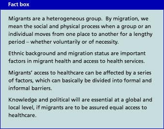 Migration means that both locally and globally our world is getting more and more multicultural. From 1975 up to the year 2000, the number of migrants in the world doubled to 175 million, which is 3% of the world's population - half of them living in low-income countries [1]. This figure includes labour migrants, permanent migrants, refugees, and asylum seekers, while undocumented migrants and people who migrate from rural to urban areas are not included. The increasing diversity of the population means new challenges for our societies, including our health services. The aim of this article is to outline a general framework for understanding the access that migrants have to healthcare and the factors that can affect that access.