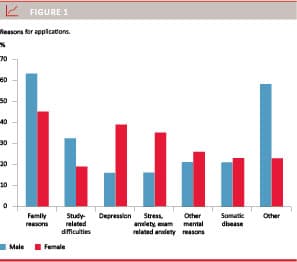Female students generally listed more emotional reasons in their applications, such as depression, stress and anxiety, than males did. Correspondingly, a greater part of the male than female students had listed study-related difficulties and family reasons.