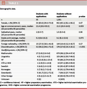 There was a significant difference in discontinuations among applicants compared with non-applicants: the majority of the applicants discontinued their studies within one year after the dispensation. Unfortunately, the reasons for their discontinuation were not registered. Hence, it may be speculated whether discontinuation was due to the reasons given in the application or caused by completely different matters. A survey from the USA [2] described that 11% of the medical students in seven different medical schools had serious thougths of dropping out. Depressive symptoms and burnout predicted serious thoughts of dropping out the following year. There were no association between gender or ethnic groups and serious thougths of discontinuing medical school.