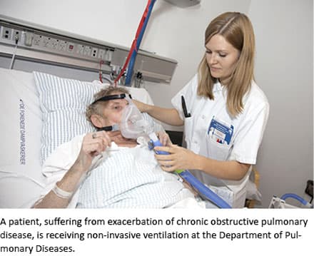 Chronic obstructive pulmonary disease (COPD) is defined as irreversibly impaired lung function, judged by spirometric measurement of the forced expiratory volume in the first second (FEV1) and airflow obstruction defined as FEV1/forced ventilator capacity (FVC) below 0.7 [1]. Many COPD patients experience acute exacerbations of COPD (AECOPD) [1], which accelerate progression of the disease [2] which is the most common cause of admission to medical wards in Denmark as well as worldwide [3, 4]. In Denmark, patients are often referred to general medical wards, departments of internal medicine, and only the minority are admitted to highly specialised units, e.g. departments of pulmonary diseases. In a Danish study, 46% were readmitted one or several times within the first year after discharge [4]. Numerous factors have been shown to predispose patiens to further hospital admissions; previous hospital admission for AECOPD, hypercapnia, low FEV1, preadmissional long-term oxygen therapy and need for non-invasive ventilation, amongst others