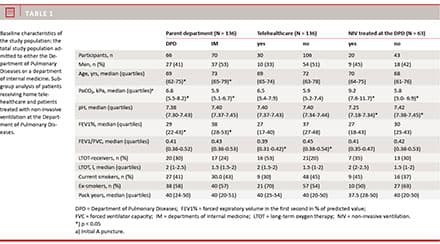 Patients at the Department of Pulmonary Diseases were significantly younger than patients admitted to departments of internal medicine (p = 0.001), had higher PaCO2 accumulation at admission and had a lower FEV1% than patients at departments of internal medicine. There were no differences in FEV1/FVC, current smoking status, number of pack years and percentage of patients with long-term oxygen therapy when comparing patients admitted to the Department of Pulmonary Diseases with patients admitted to departments of internal medicine. More patients at the Department of Pulmonary Diseases (n = 20) than at the departments of internal medicine (n = 10) were included in the telehealthcare project. Patients participating in the telehealthcare project were more obstructive and had more days at hospital than non-participating patients did. There was a trend for patients participating towards being females and previous smokers. There was no difference in FEV1% between participating and non-participating patients.