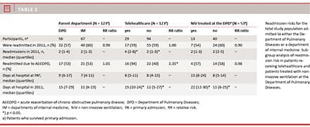 When comparing patients with and without telehealthcare, patients with telehealthcare were readmitted a median of four times during follow-up compared with two times for patients who did not have telehealthcare (p = 0.026) and admissions were more often due to AECOPD (RR = 2.35; p < 0.0001).