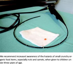 We recommend a revision and rectification of the existing National Board of Health recommendations in order to increase health visitors´ and especially parents’ awareness of the hazards of small crunchy organic food items, especially nuts and carrots, given to children under three years of age.