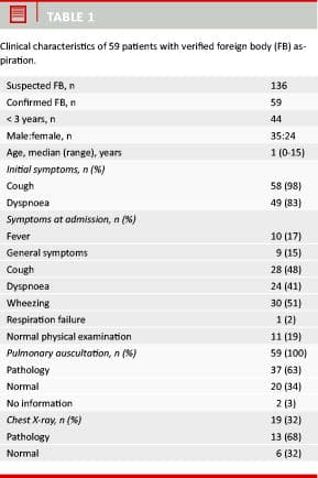 The presenting symptom of FB aspiration depends on its location, size and chronicity. The symptoms and findings vary from an unaffected child in no apparent distress to impending airway failure. Patients presenting immediately after an aspiration usually present with sudden onset of choking, cough and shortness of breath. Other symptoms may be throat pain, stridor, dyspnoea, wheezing, hoarseness or fever. Many patients have only some or none of these signs and symptoms, and the classic triad of cough, wheezing and asymmetric breath sounds is neither a sensitive nor a specific indicator of an aspirated FB [1, 2, 4, 7, 8]. These early symptoms resolve when the mucosal cough receptors accommodate, and the child may therefore be completely asymptomatic when evaluated. This may delay the diagnosis of a partial obstruction for weeks to months [9]. Retrieval of aspirated FB is essential due to the risk of asphyxia, atelectasis or bronchiectasis, granulation tissue, recurrent pneumonia and death [1, 7].