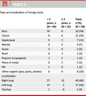 The most common FB location was the right bronchial tree (40 FBs (68%)), followed by 17 FBs (29%) in the left bronchial tree. Two (3%) FBs were located in the trachea (Table 2).