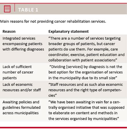 The 23 municipalities (25%) which reported that they did not provide rehabilitation services addressing cancer patients’ needs were asked to describe the main reasons for this. Almost half (n = 10) responded that they were in the process of planning such services. The main reasons for not offering cancer rehabilitation are presented in Table 1.