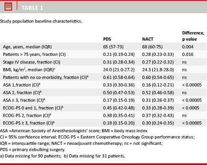 It has not yet been established how to best differentiate between patients who are well-suited candidates for PDS and those who should be referred to NACT. One major question is to determine the possibility of achieving the complete removal of the tumour burden with PDS. To date, no diagnostic strategy has been able to solve this problem [14], which makes the decision-making process vulnerable to individual evaluation and individual preference with regard to first-line treatment. In 2011, Kang et al tried to identity patients who would benefit from treatment with NACT [15]. When tested with multivariate Cox analysis, patients with an initial CA-125 above 2,000 U/ml had increased progression-free survival when treated with NACT compared with PDS. Also in 2011, Aletti et al [16] found that complex surgical procedures improve survival except for patients older than 75 years who have a high tumour dissemination or stage IV disease and have a poor performance or nutritional status. Collectively, this indicates that the patients who could potentially benefit from treatment with NACT are the older patients with advanced disease and who are in poor medical condition.
