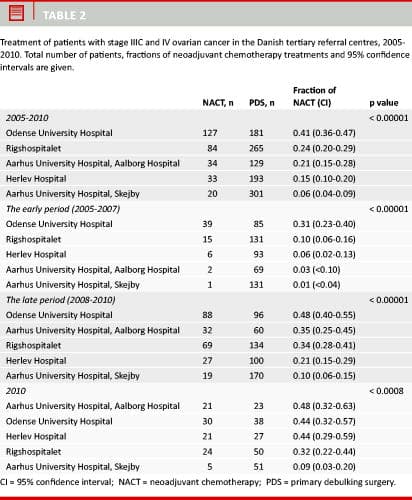The 2005-2010-period saw a significant increase in the proportion of Danish patients with stage IIIC and IV ovarian cancer treated with NACT. Thus, the proportion tripled during the six-year study period, and the most prominent increases were observed in 2008 and 2009. In the last year of registration, at least one in three patients was treated with NACT. The reasons for this increased use are unknown, but several explanations are possible. At the International Gynaecological Cancer Society meeting in Bangkok in October 2008, Professor Ignace Vergote presented preliminary data from his later publication [6], which concluded that there was no difference in survival between patients treated with either PDS or NACT. Hence, the result supported that NACT is as safe and effective as PDS and this may have influenced Danish gynaecologists. In addition, the increased centralization during the previous decade has meant that a larger fraction of patients are being treated in centre hospitals which explain the increased annual number of patients towards the end of the study period. It has been shown that Danish patients treated in regional hospitals have an inferior ECOG performance status than those treated at centre hopitals, and it was demonstrated that regional hospitals use NACT less frequently than centre hospitals [7]. Consequently, the increased centralization may have contributed to the increased use of NACT in centre hospitals. A notable variation in the use of NACT between the five centres was found, ranging from NACT being used in nearly half of the patients to being used in approximately one in ten patients. As indicated by Table 1, the patients referred to NACT were older and in a poorer medical condition than those receiving PDS. This is in agreement with the recommendations from the Danish Gynaecological Cancer Group [4], but, clearly, the five centres interpret these recommendations differently.