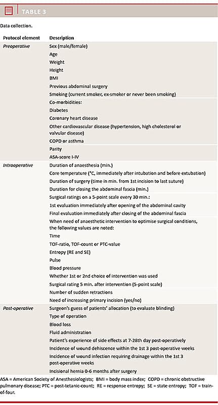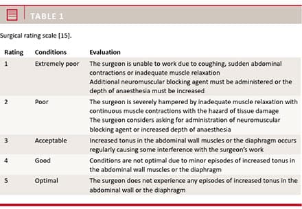 Surgical conditions are evaluated on a five-point subjective rating scale: after placement of retractors, every 30 min. (retrospectively from the previous assessment to the present) and after closure of the abdominal wall (Table 1) [13]. Applicability of the five-point rating scale was tested on five patients prior to inclusion. The surgeons, blinded to whether NMB was applied, practiced the use of the scale two at the time, and disagreements on its use were discussed and reconciled. Additionally, all surgeons received a written instruction of how to use the scale.