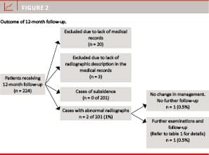 Patients with major per- or post-operative complications such as fracture, deep infection, or dislocation and cases requiring bone transplantation were excluded. Patients having complaints that led to early referral and additional outpatient follow-up outside of the planned three- and 12-month follow-up visits were also excluded. Any event during the planned three- and 12-month outpatient visits was counted as a positive endpoint provided the event led to additional outpatient follow-up visits, weight bearing restriction, or any change in treatment strategy provided that abnormalities were also present in the radiograph. Patients with lacking data were excluded.