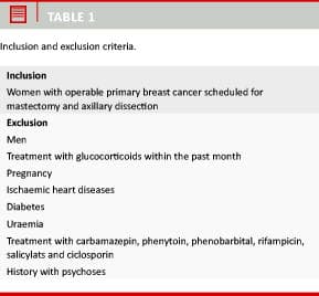 During a 12-month period, patients with operable primary breast cancer scheduled for mastectomy and axillary dissection and meeting the inclusion criteria of this study (Table 1) were included. Informed, written consent was obtained and the patients were randomized to the administration of glucocorticoid or no medical treatment; randomization was performed by means of sealed envelopes, prepared and numbered in random order by a consultant who did not participate in the study. The envelopes indicated to which group the patient belonged. If the patients were randomized to receive glucocorticoid, an intravenous injection of 125 mg methylprednisolone sodium succinate was given as a single bolus 1.5 hours before the start of surgery.